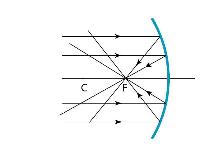 - Apabila sinar cahaya yang selari mengena suatu cermin cekung, sinar cahaya akan dipantul balik ke arah dalam.